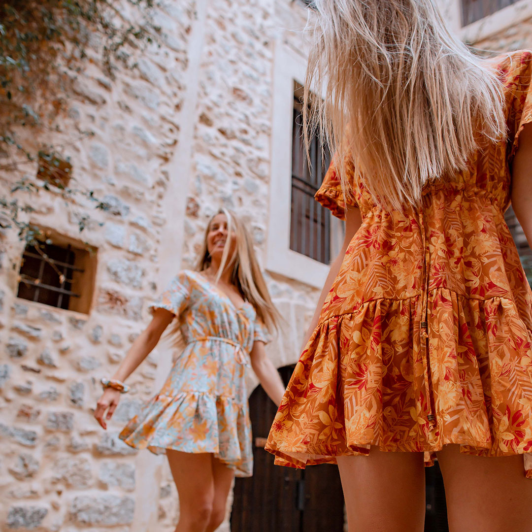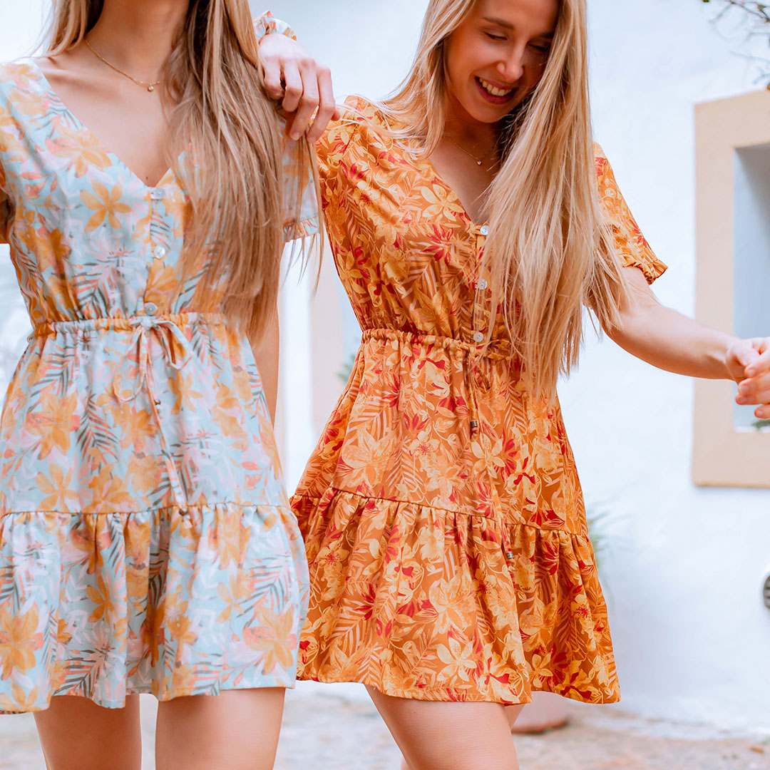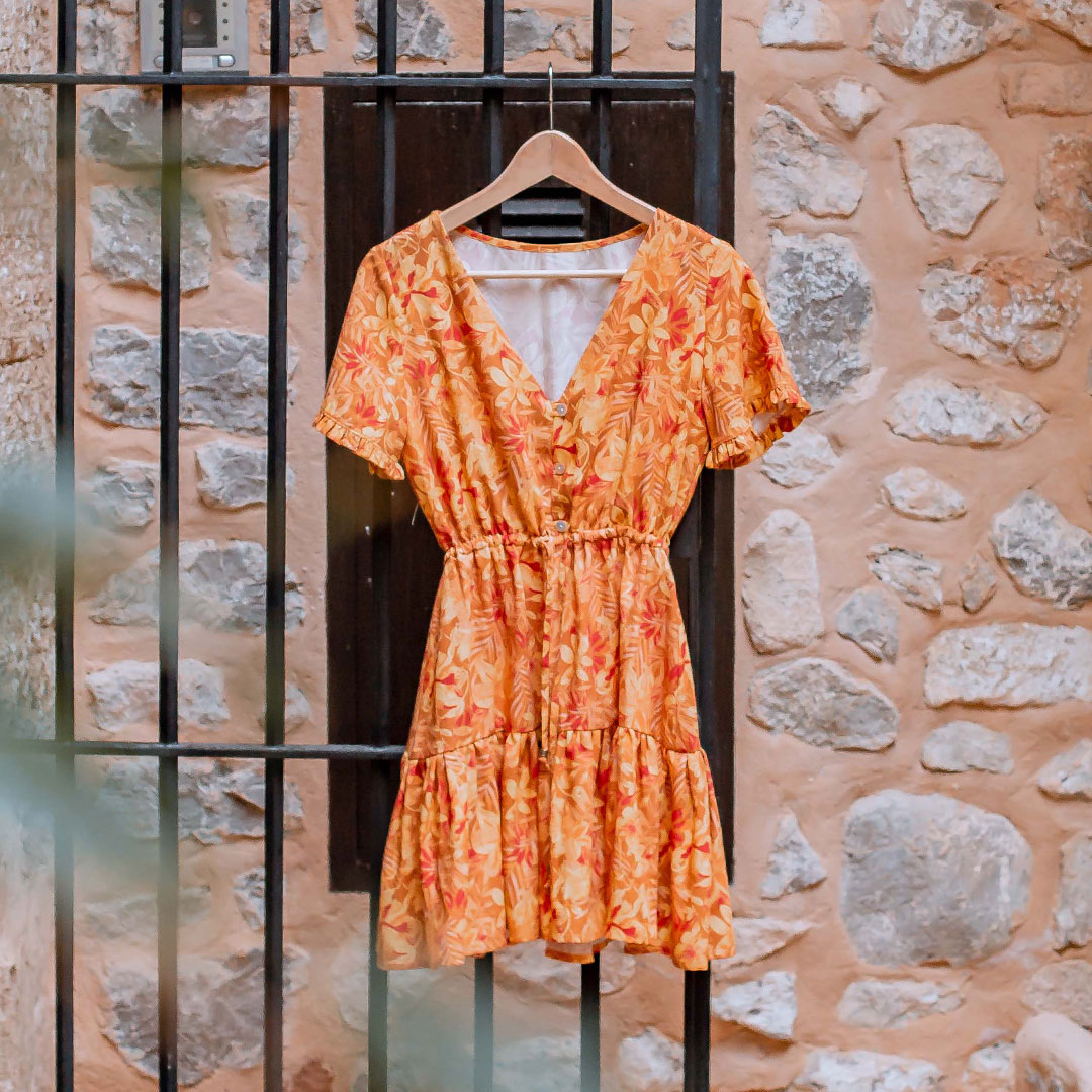 Contiene volantes en la parte inferior para darle movimiento. Las mangas son cortas, perfectas para días de verano, tanto soleados como nublados. El escote es de tipo pico y se cierra con tres botones de color nacarado. La cintura se ajusta con una goma y las cuerdas que permiten hacerlo llevan dos abalorios de color bronce. Ver guía de tallas a continuación: