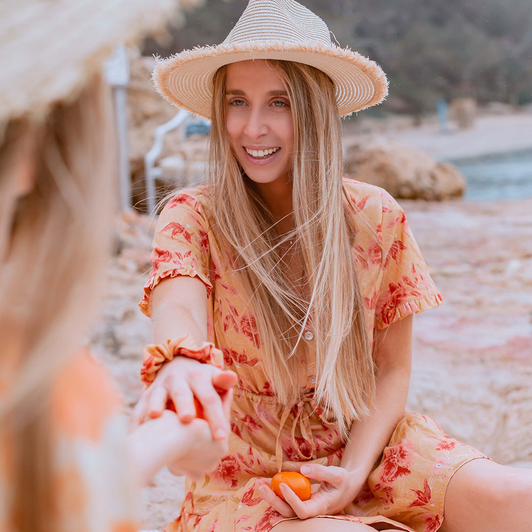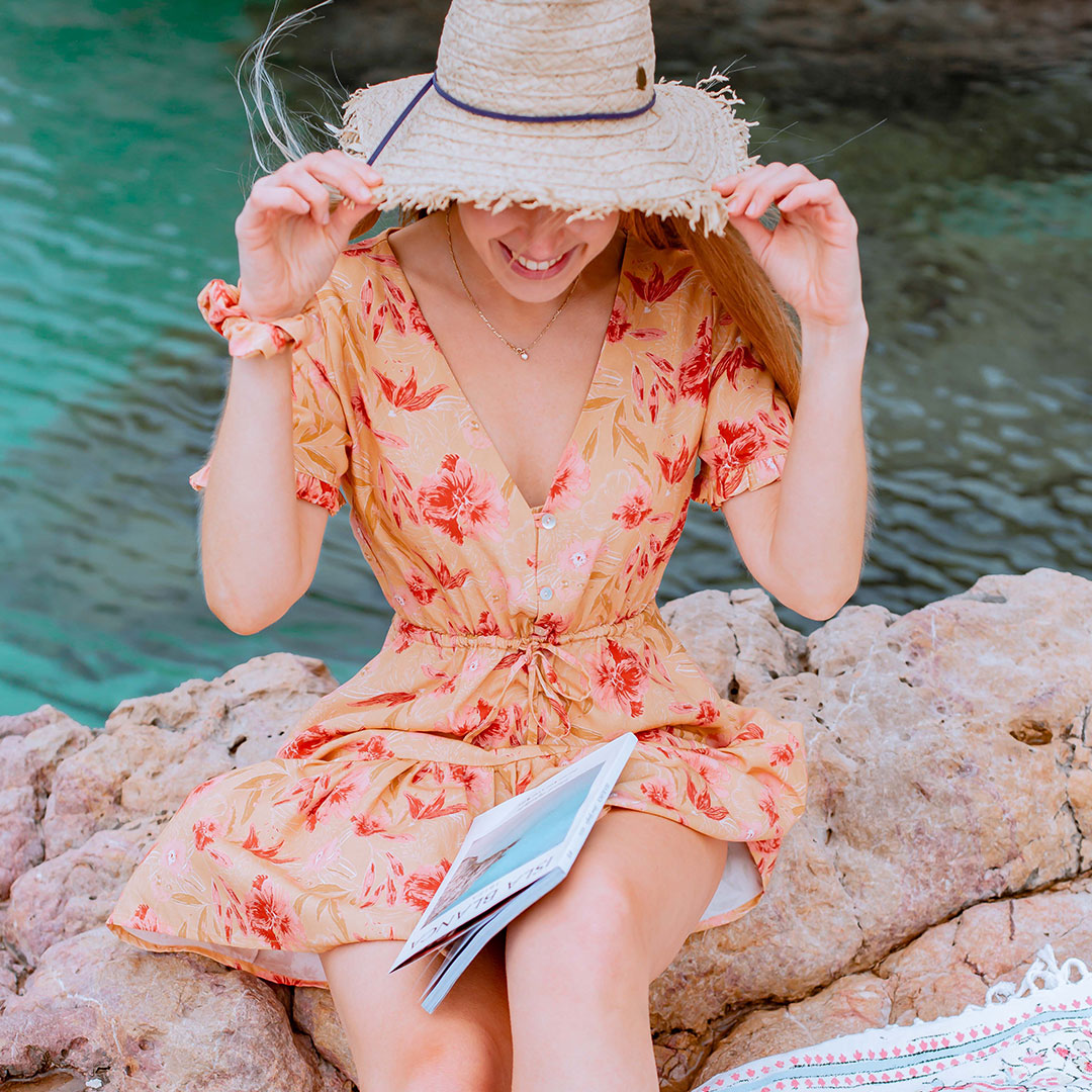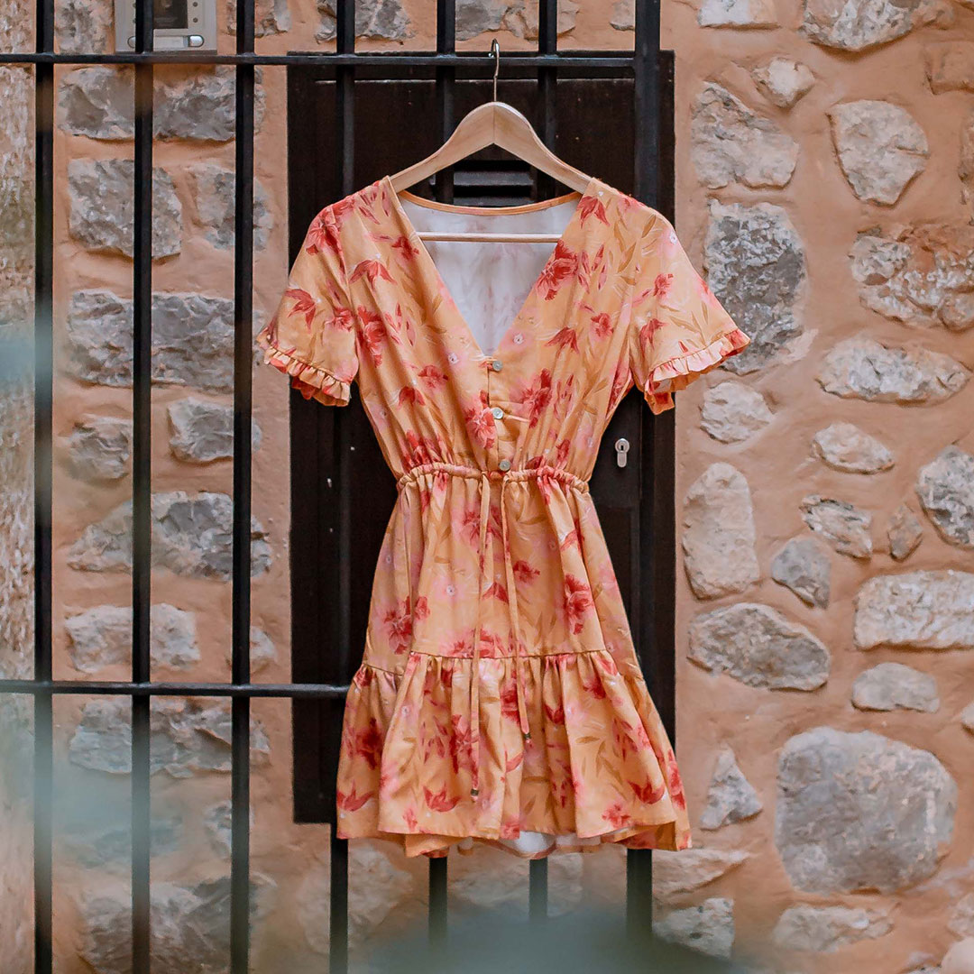 Contiene volantes en la parte inferior para darle movimiento. Las mangas son cortas, perfectas para días de verano, tanto soleados como nublados. El escote es de tipo pico y se cierra con tres botones de color nacarado. La cintura se ajusta con una goma y las cuerdas que permiten hacerlo llevan dos abalorios de color bronce. Ver guía de tallas a continuación: