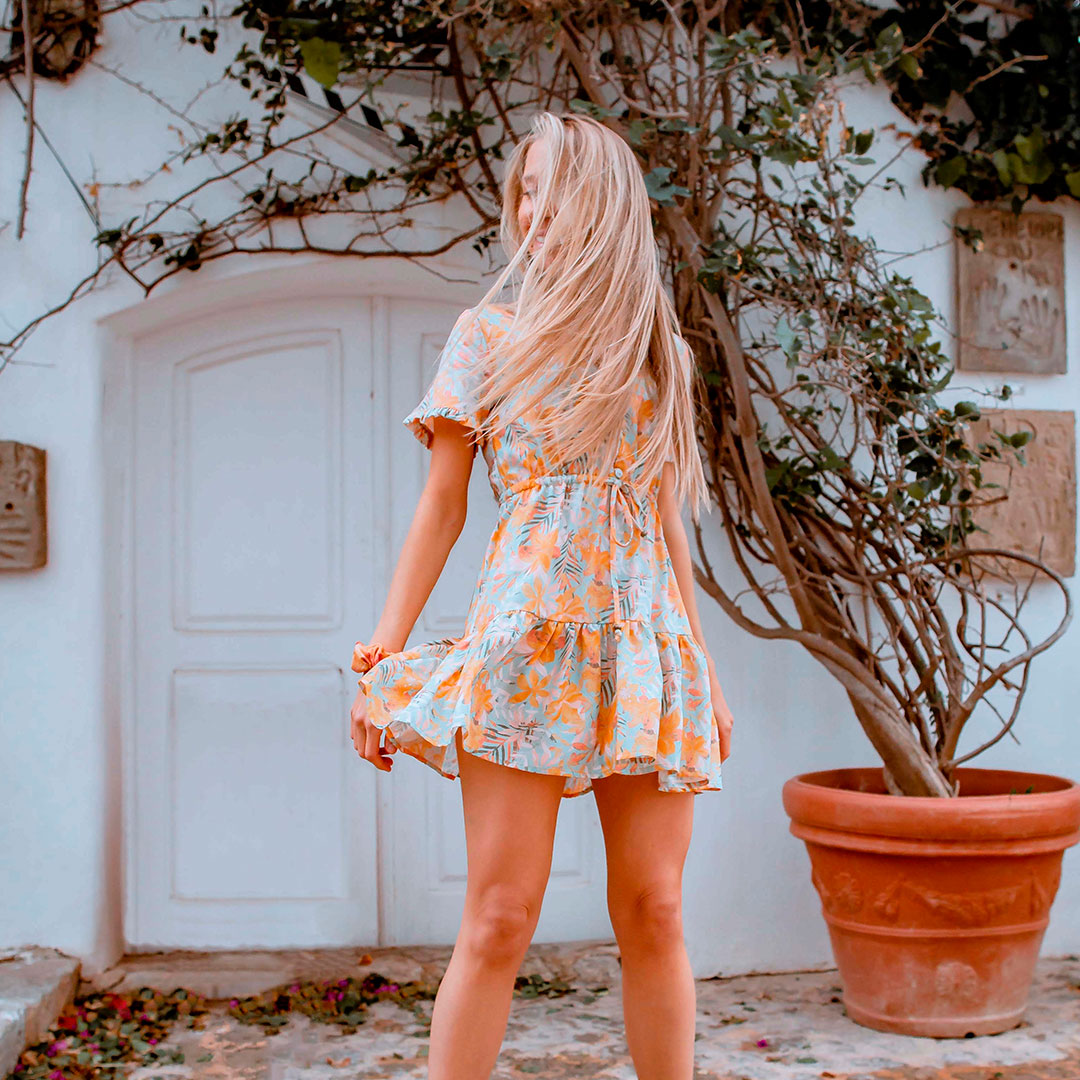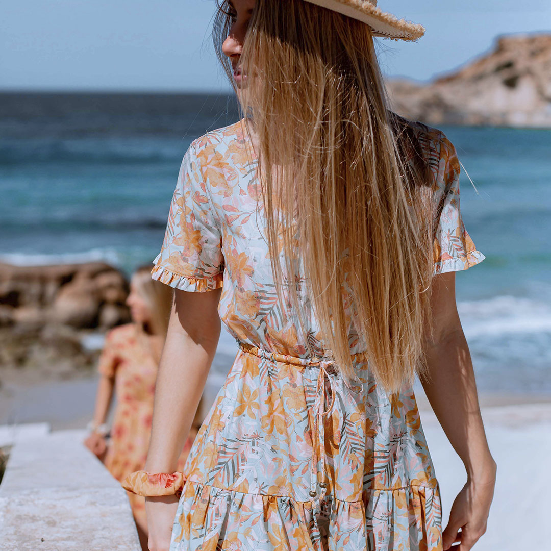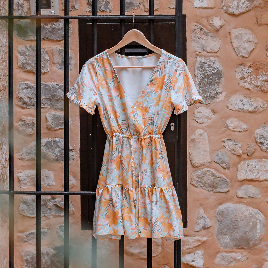 Contiene volantes en la parte inferior para darle movimiento. Las mangas son cortas, perfectas para días de verano, tanto soleados como nublados. El escote es de tipo pico y se cierra con tres botones de color nacarado. La cintura se ajusta con una goma y las cuerdas que permiten hacerlo llevan dos abalorios de color bronce. Ver guía de tallas a continuación: